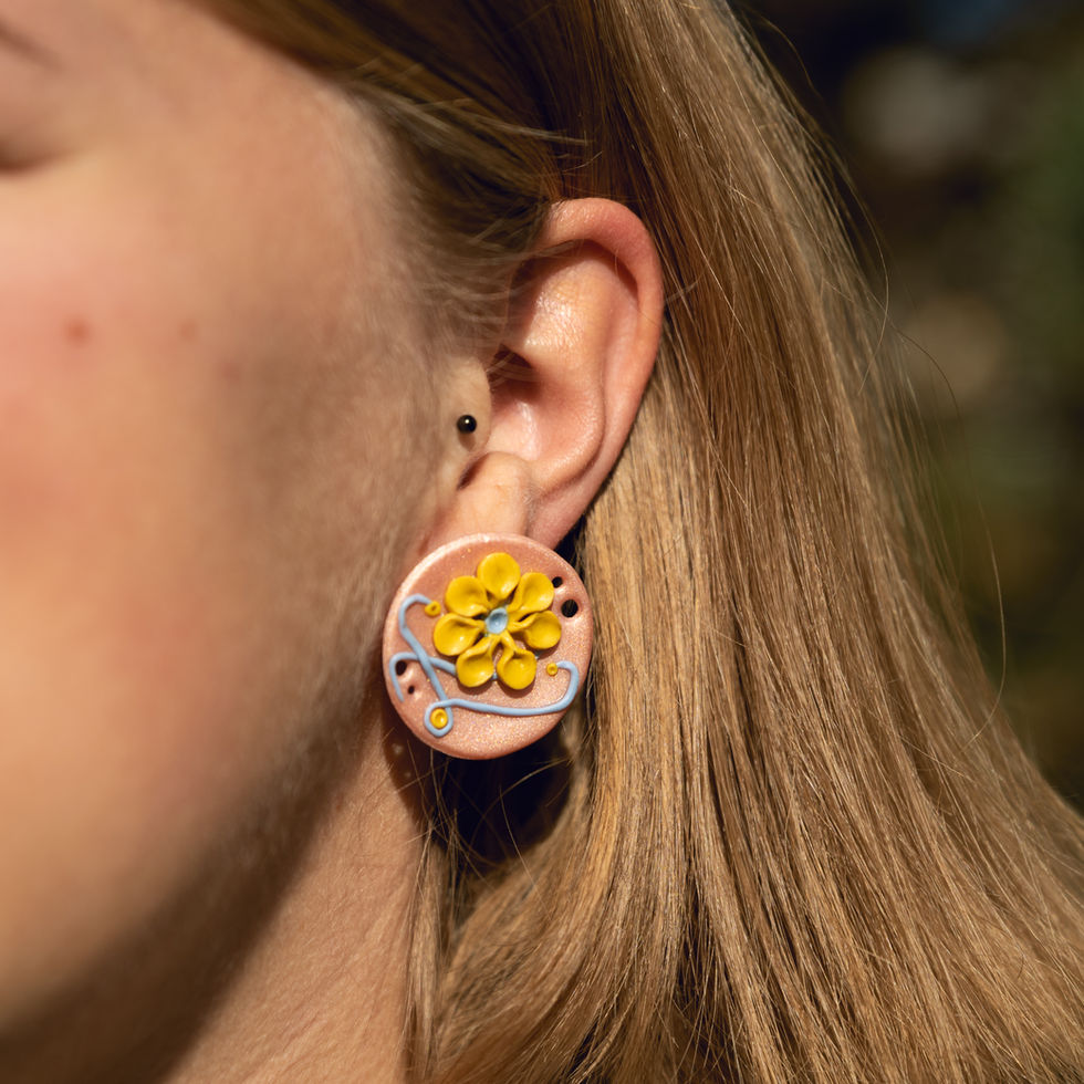 Lengvi, prie ausies prigludę auskarai iš polimerinio molio. Dvelkiantys pavasariu ir žydėjimu, gaiva ir elegancija.